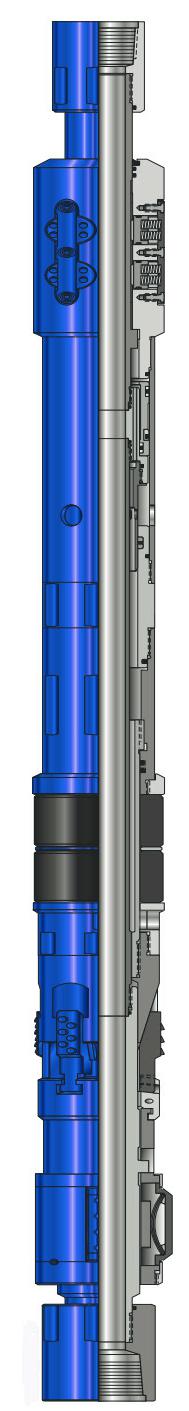 該封隔器是一種具有同軸旁通的懸掛式可回收封隔器。當工具進入井中時J型槽保持旁通打開,同時控制封隔器座封,當封隔器座封后,油管壓力驅(qū)動驅(qū)動平衡活塞,保持旁通關(guān)閉。